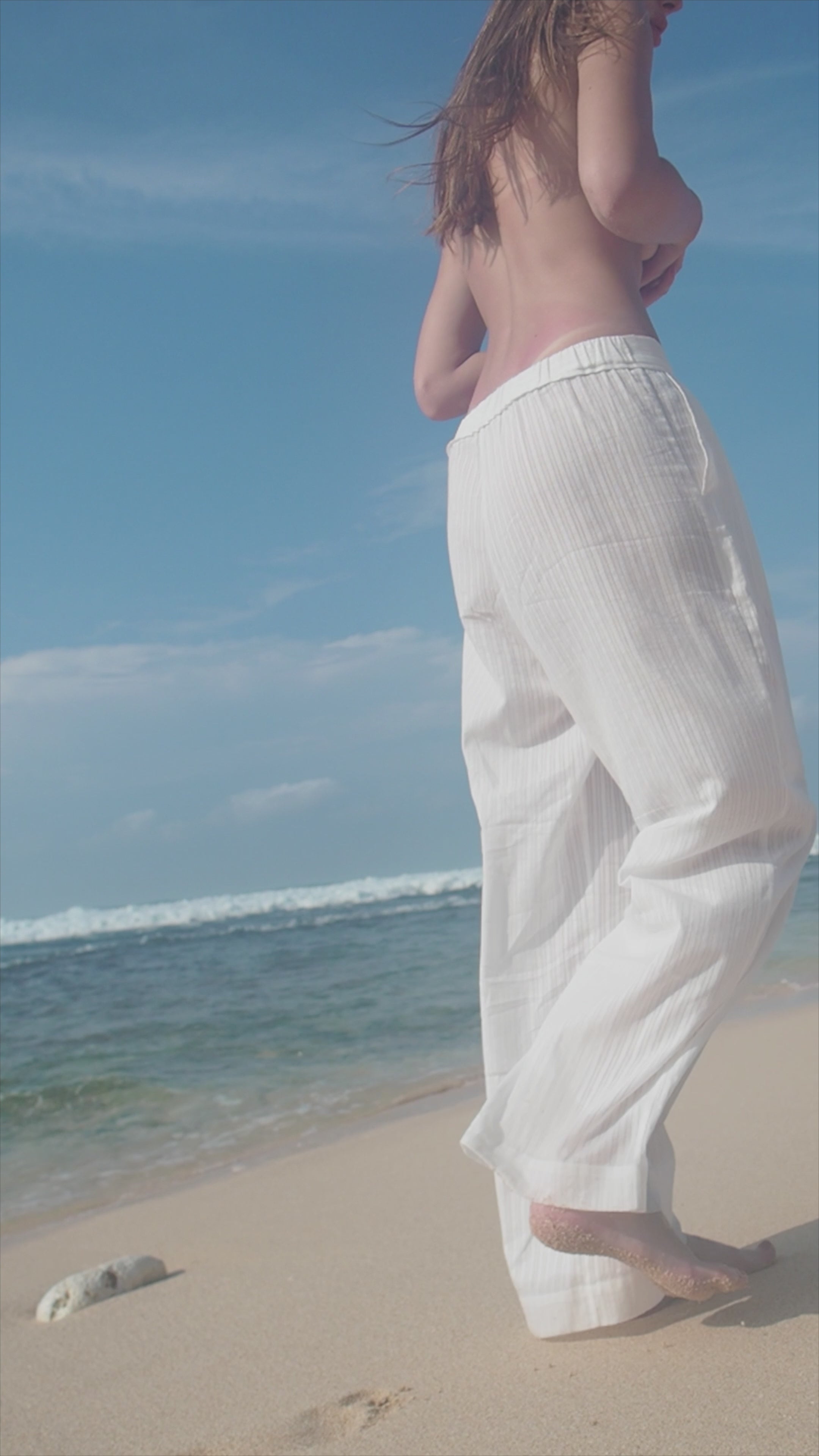 The shirt is cut in a relaxed silhouette with side seams finished by delicate button detailing—an understated nod to utility and ease.
